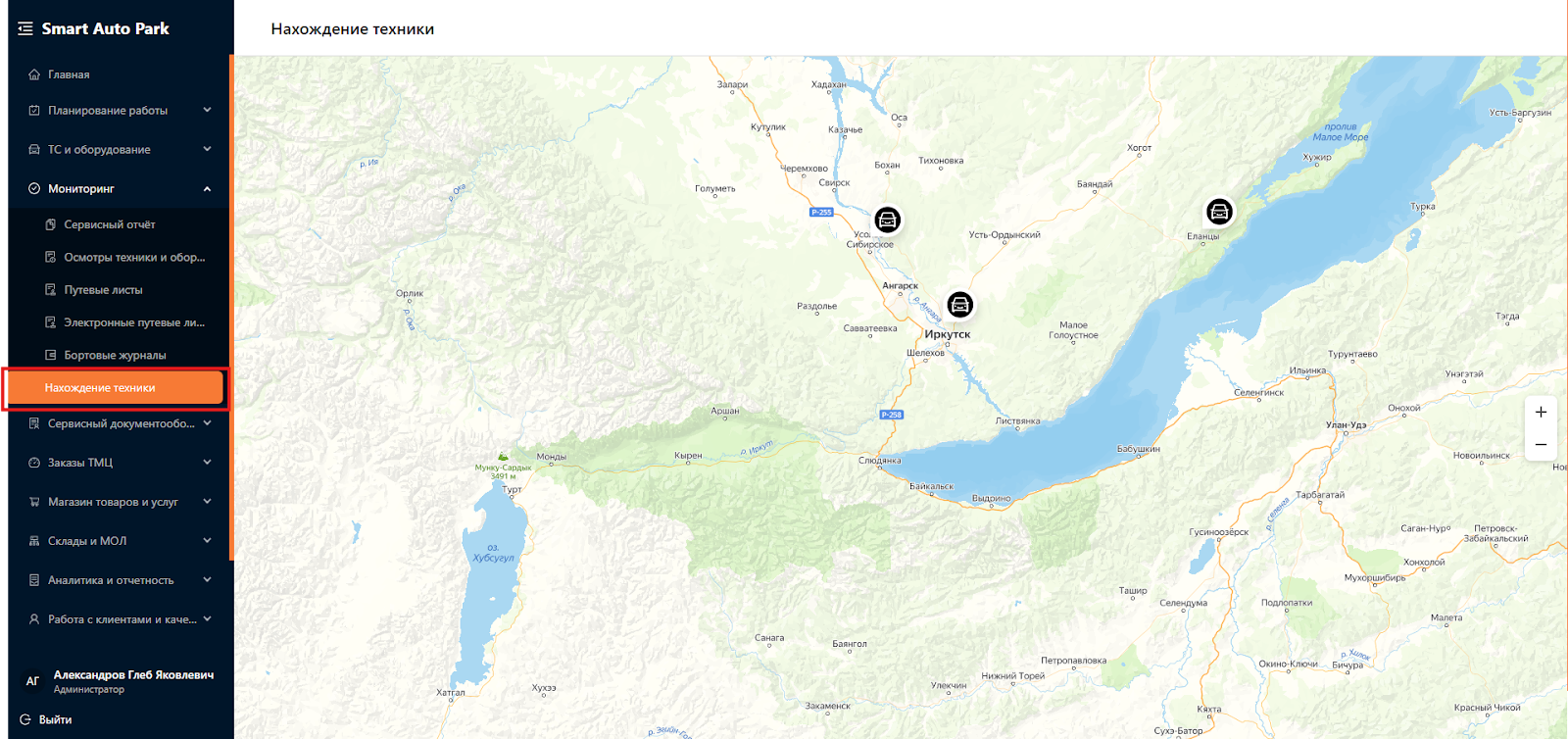 Для отображения всех ТС, которые принадлежат автопарку, необходимо перейти в раздел “Мониторинг” в подраздел “Нахождение техники” (см. рисунок 14).