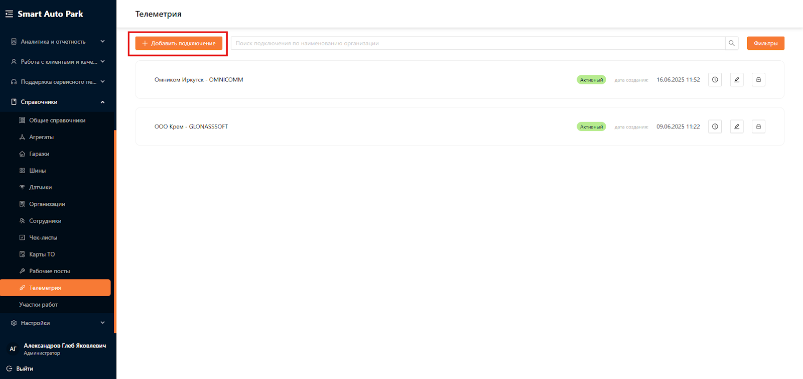 Для создания нового подключения, нажмите на кнопку “Добавить подключение” в левом верхнем углу веб-страницы, используя одну из следующих пользовательских ролей: “Администратор”, “Менеджер автопарка”, “Операционист” (см. рисунок 3).