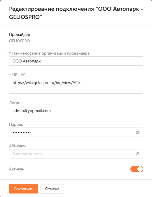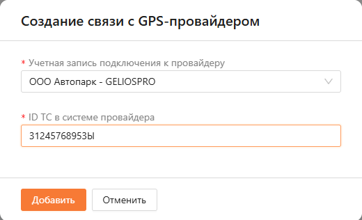 При добавлении новой связи заполните поля. На рисунке 8 показан пример заполнения полей создания связи с GPS-провайдером. После завершения заполнения нажмите кнопку “Добавить”.