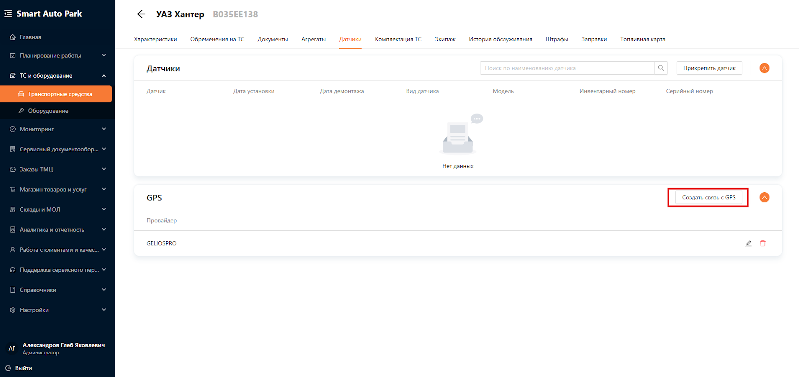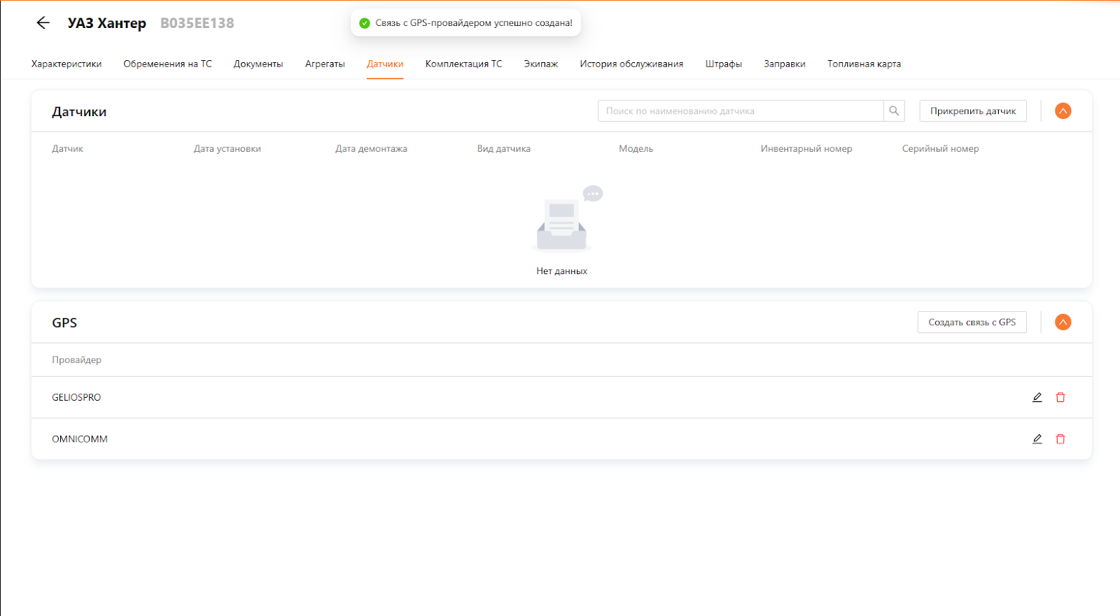 Для создания новой связи GPS с ТС перейдите в раздел “ТС и оборудование”, подраздел “Транспортные средства”. Выберите вкладку “Датчики”, как представлено на рисунке 6.