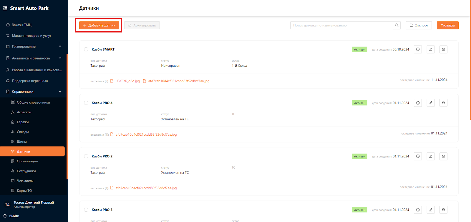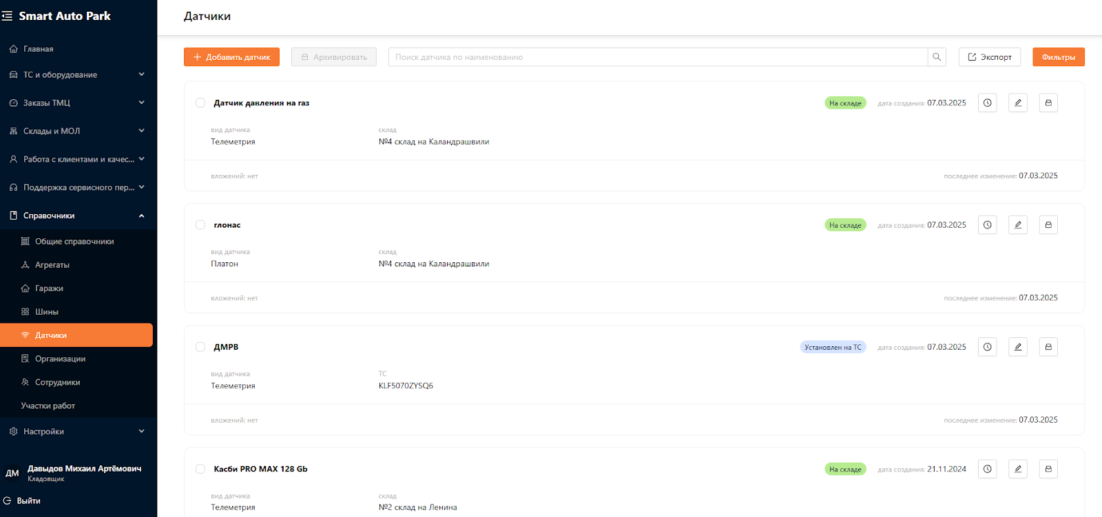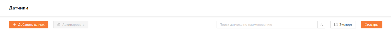 В выбранной подсистеме у пользователей с ролью “Администратор”, “Менеджер автопарка”, “Операционист” или “Кладовщик” есть доступ к кнопкам “Добавить датчик”, “Архивировать”, “Экспорт” и “Фильтры” (см. рисунок 3).