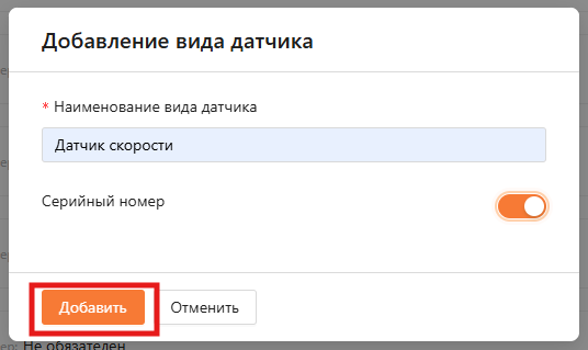При добавлении нового вида датчика заполните поле “Наименование вида датчика” и укажите обязательность ввода серийного номера. На рисунке 10 показан пример заполнения полей для вида датчика. После завершения заполнения нажмите кнопку “Добавить”.