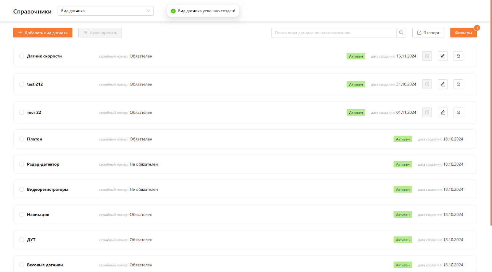 Для работы с датчиками выберите раздел “Справочники” подраздел “Датчики”. На рисунке 1 представлен интерфейс, который видят пользователи с ролью “Администратор”, “Менеджер автопарка”, “Операционист”, “Кладовщик”.