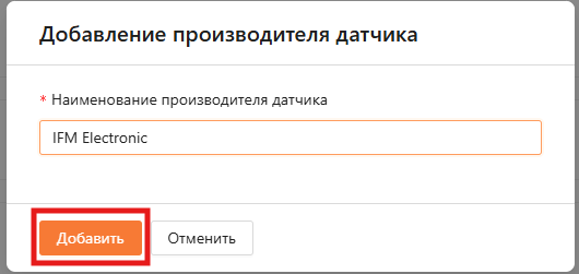 При добавлении нового производителя датчика заполните поле “Наименование производителя датчика”. На рисунке 13 показан пример заполнения производителя датчика. После завершения заполнения нажмите кнопку “Добавить”.