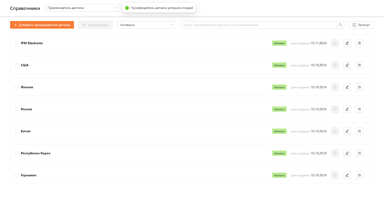 Система сообщит о сохранении производителя датчика и откроет список производителей датчиков (см. рисунок 14).
