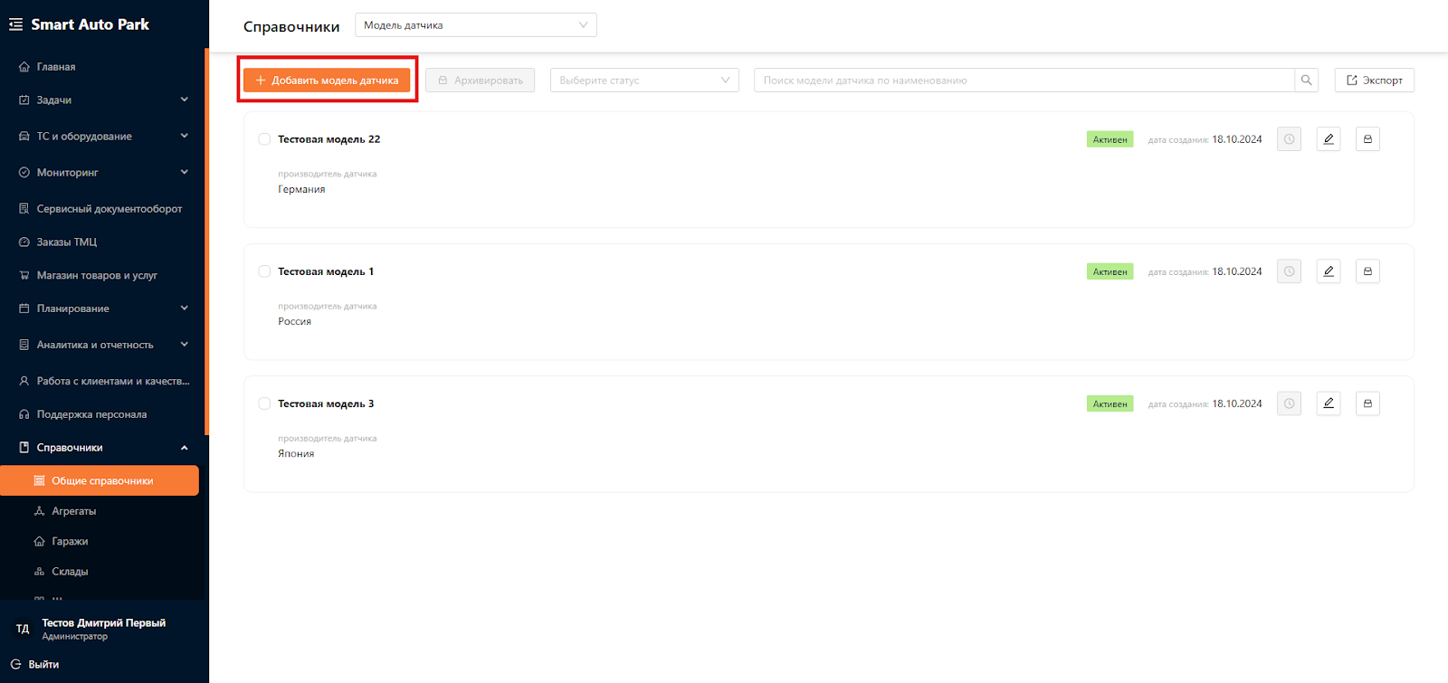 Для создания новой модели датчика, нажмите на кнопку “Добавить модель датчика” в левом верхнем углу веб-страницы, используя одну из следующих пользовательских ролей: “Администратор”, “Менеджер автопарка”, “Операционист” или “Кладовщик” (см. рисунок 15).