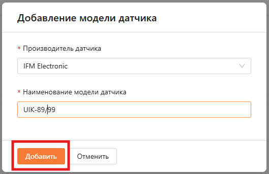 При добавлении новой модели датчика выберите производителя из справочника “Производитель датчика” и заполните поле “Наименование модели датчика”. На рисунке 16 показан пример заполнения модели датчика. После завершения заполнения нажмите кнопку “Добавить”.
