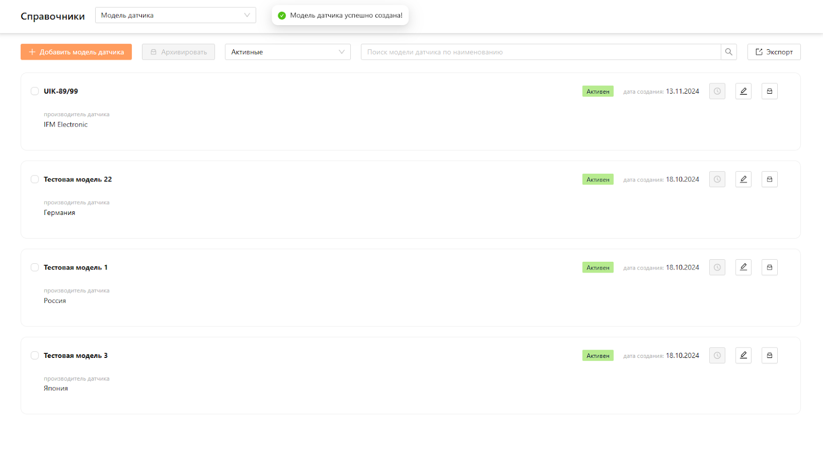 Система сообщит о сохранении модели датчика и откроет список моделей датчиков (см. рисунок 17).