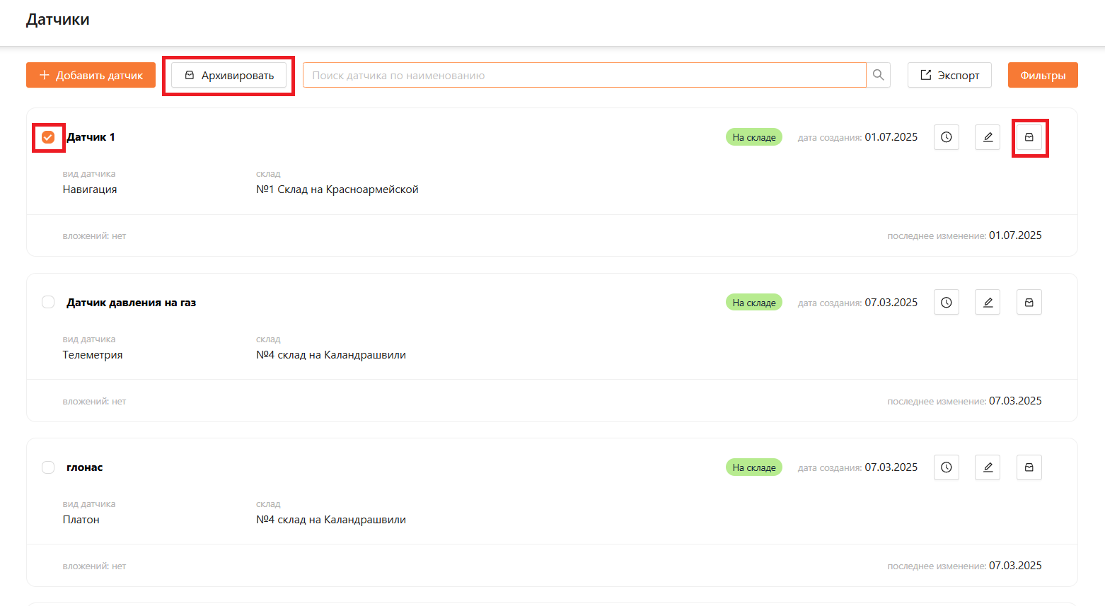 Для массового или одиночного архивирования необходимо выбрать датчик и нажать на кнопку “Архивировать” либо нажать на кнопку справа (см. рисунок 18). Архивировать датчик можно только со статусом “На складе”.