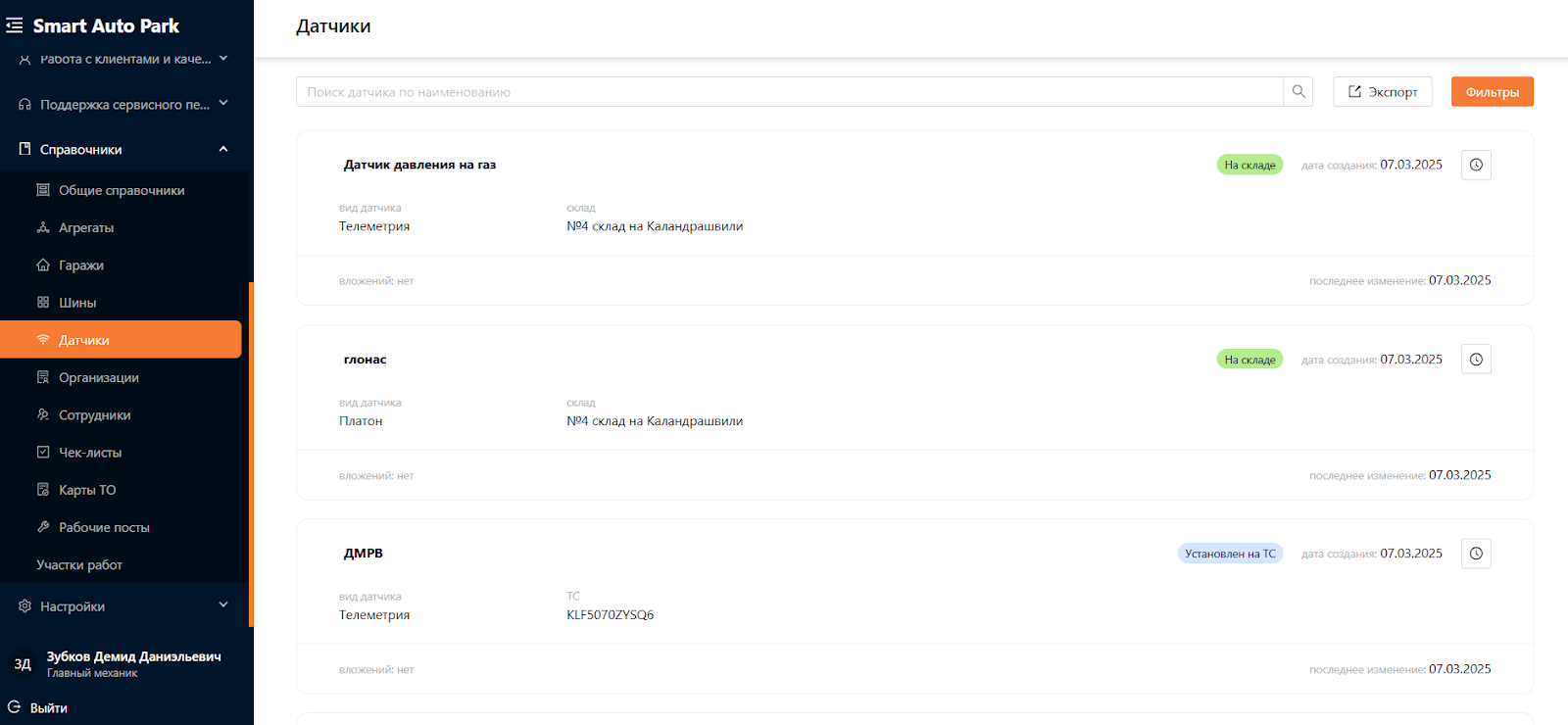 Пользователям с ролью “Механик”, “Главный механик” доступны кнопки “Экспорт” и “Фильтры” (см. рисунок 4).