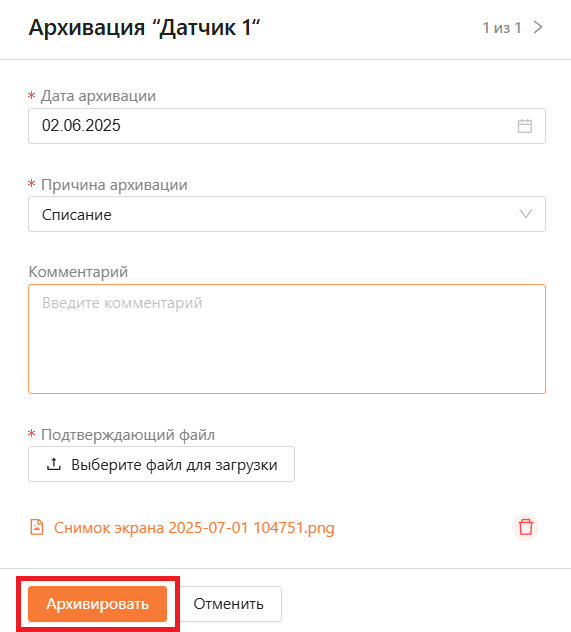 Выберем причину “Списание” и заполняем все обязательные поля. Далее нажмем на кнопку “Архивировать” (см. рисунок 20).