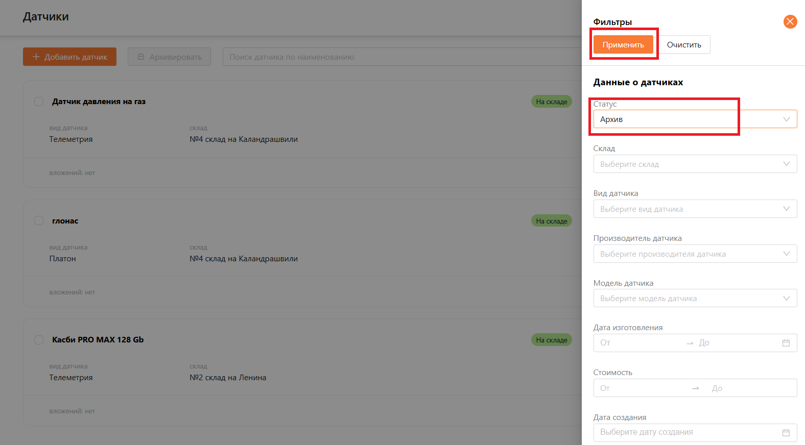 Для просмотра архивных датчиков необходимо в фильтрах выбрать статус “Архив” и нажать на кнопку “Применить” (см. рисунок 22).