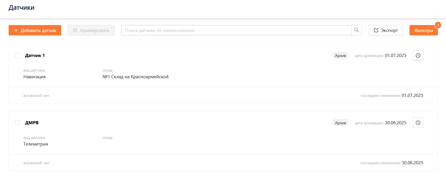 После применения фильтра в общем списке отобразятся только те датчики, которые находятся в статусе “Архив” (см. рисунок 23).