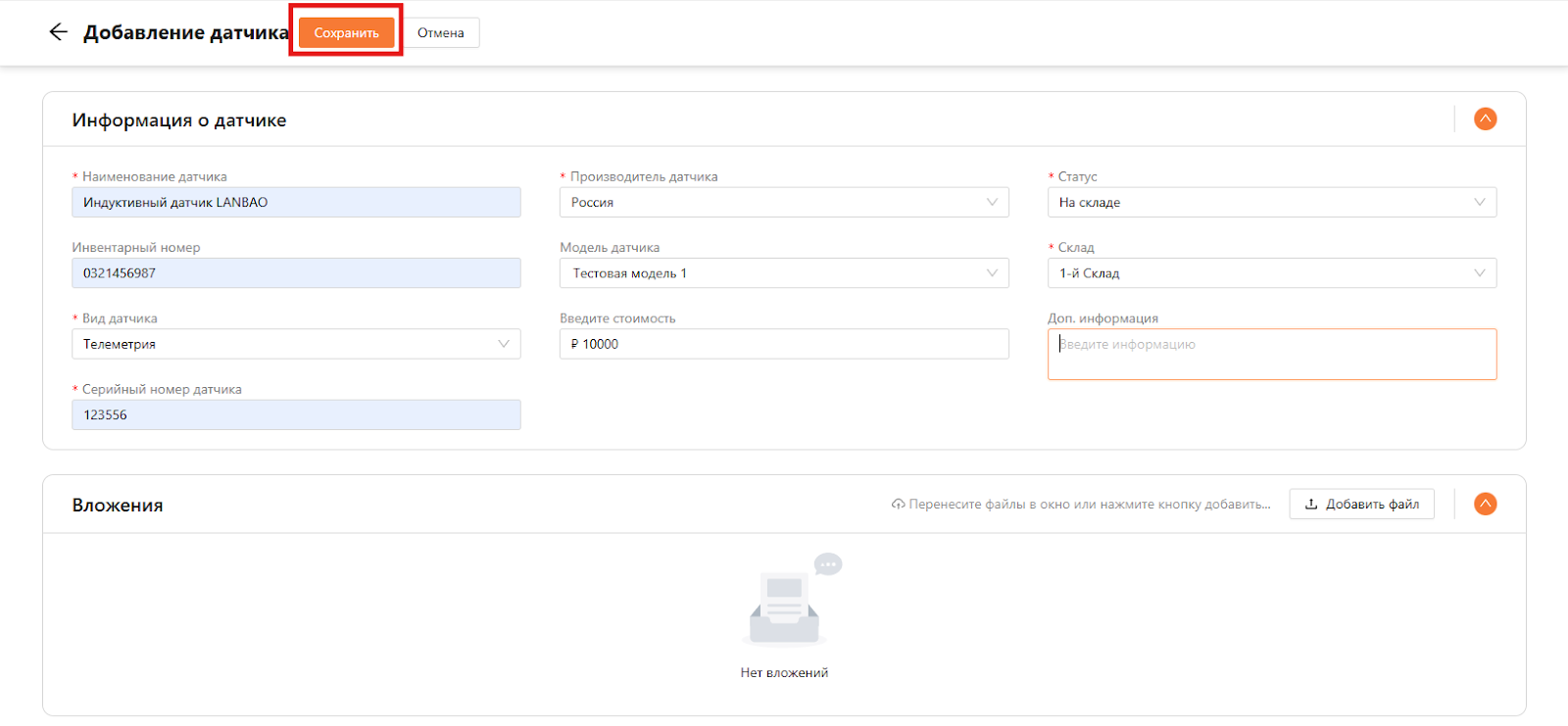При добавлении нового датчика обязательно заполните поля, отмеченные звездочкой; остальные поля можно заполнить по желанию. На рисунке 6 показан пример заполнения полей для датчика. После завершения заполнения нажмите кнопку “Сохранить”.
