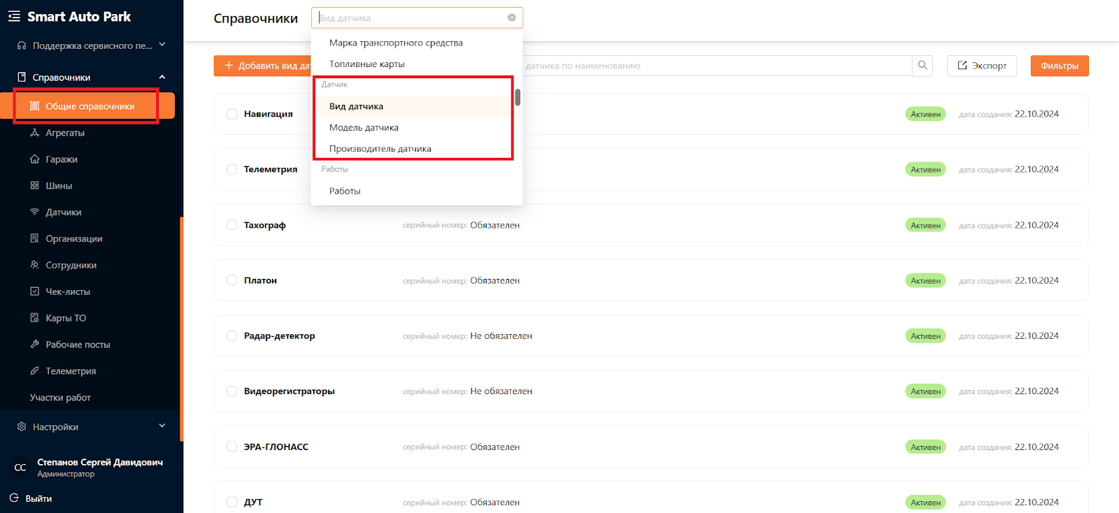 Система для управления автопарком предназначена для автоматизации и оптимизации всех аспектов эксплуатации и обслуживания транспортных средств и оборудования. Система является комплексным решением, охватывающим всю деятельность, связанную с управлением автопарка, от учета и мониторинга транспортных средств до планирования и аналитики. Одним из подразделов Системы является “Датчики”.