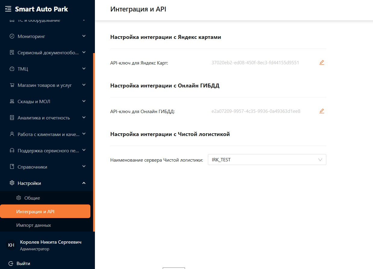 Раздел настройки содержат подразделы "Общие", "Интеграция и API", "Импорт данных". Этот раздел позволяет управлять интеграцией с Яндекс картами, Онлайн ГИБДД, а также выполнять импорт и экспорт данных.