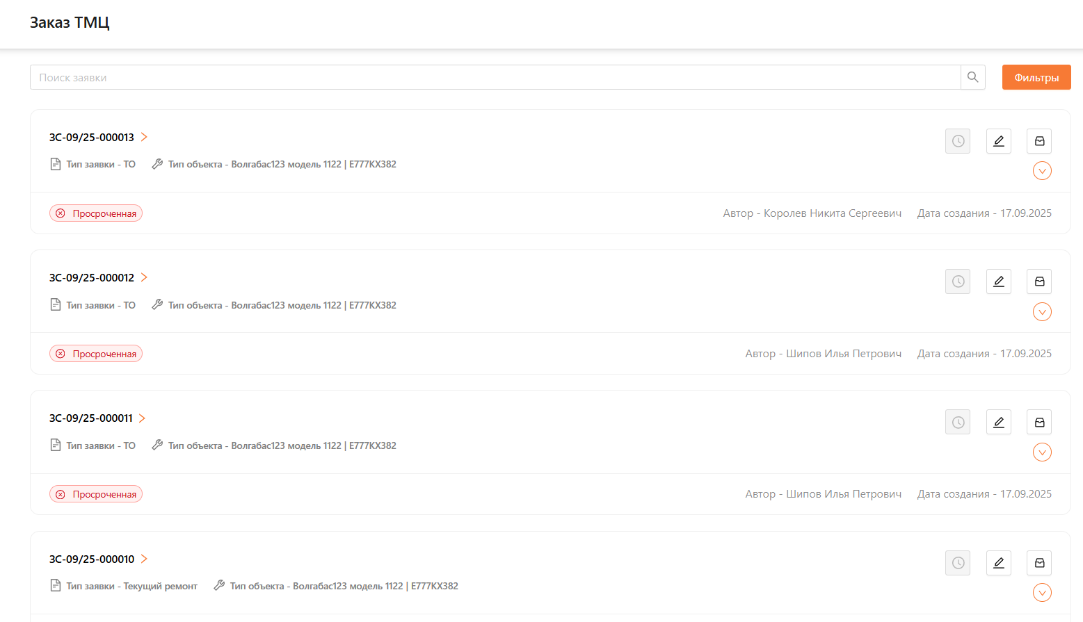 Для работы с заявками выберите раздел “ТМЦ” подраздел “Заказ ТМЦ”. На рисунке 1 представлен интерфейс, который видят пользователи с ролью “Администратор”, “Менеджер автопарка”, “Операционист”, “Механик”, “Главный механик”.