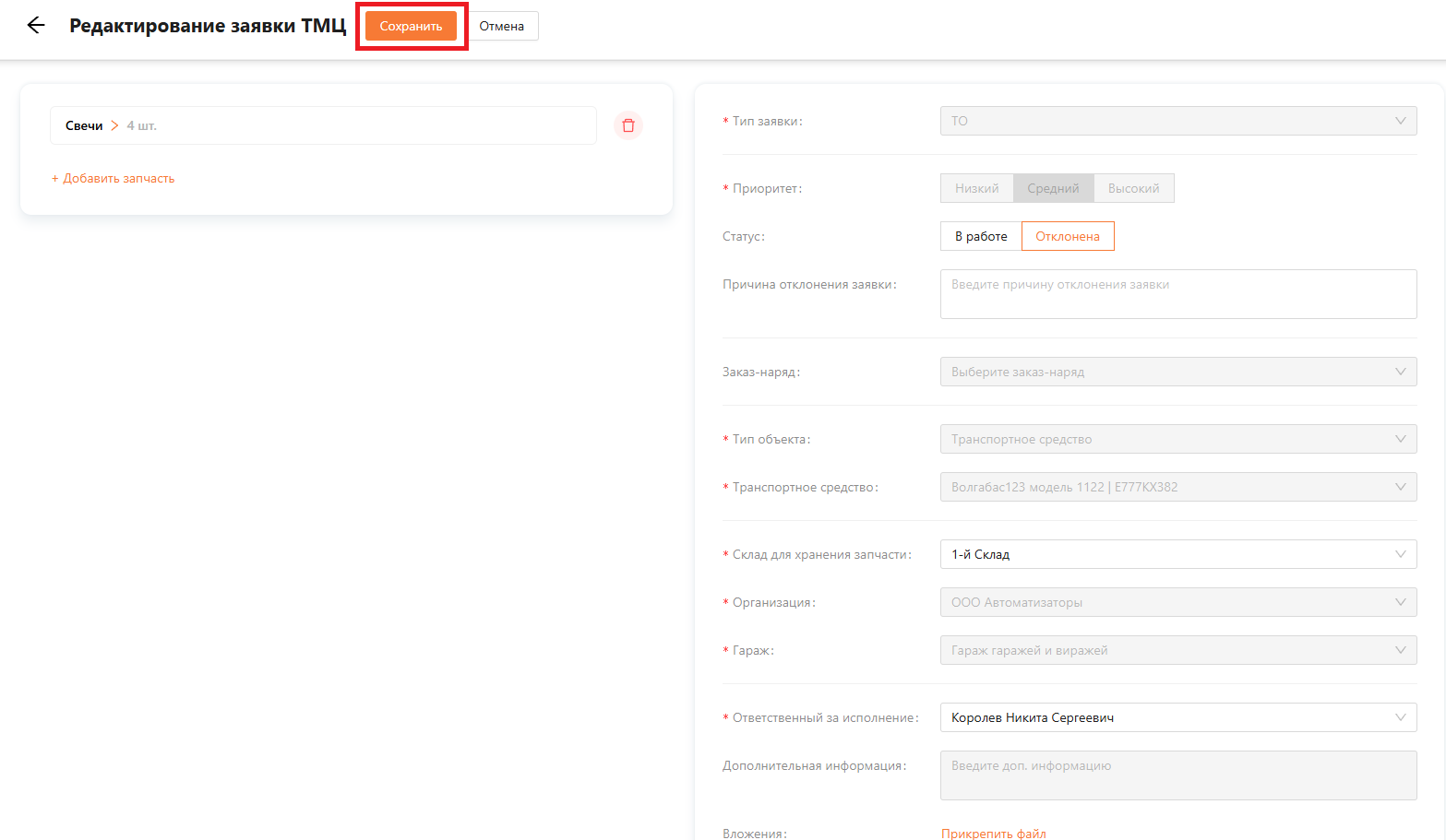 Пользователь заполняет статус заявки, склад, ответственного за исполнение (см. рисунок 11). Также можем изменить информацию о запчасти.