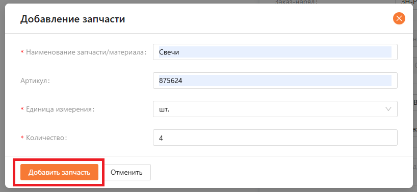 Заполняем информацию по запчати на нажимаем на кнопку “Добавить запчасть” (см. рисунок 8).