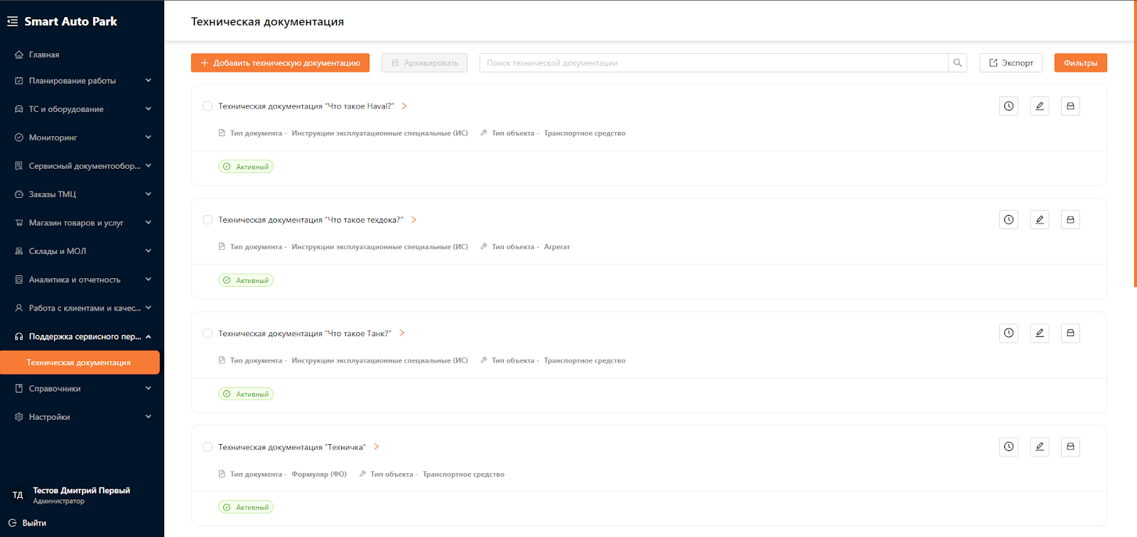 В выбранной подсистеме у пользователей с ролью “Администратор”, “Менеджер автопарка”, “Операционист”, “Механик”, “Главный механик” есть доступ к кнопкам “Добавить техническую документацию”, “Архивировать”, “Экспорт” и “Фильтры” (см. рисунок 3).