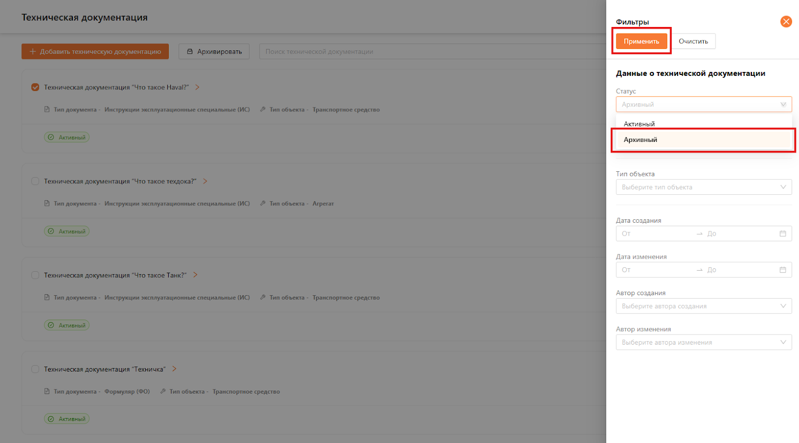 Для просмотра архивной технической документации необходимо в фильтрах выбрать статус “Архив” и нажать на кнопку “Применить” (см. рисунок 10).