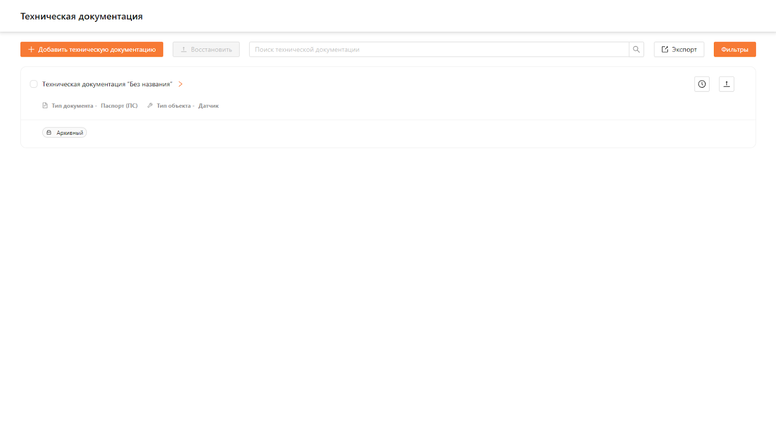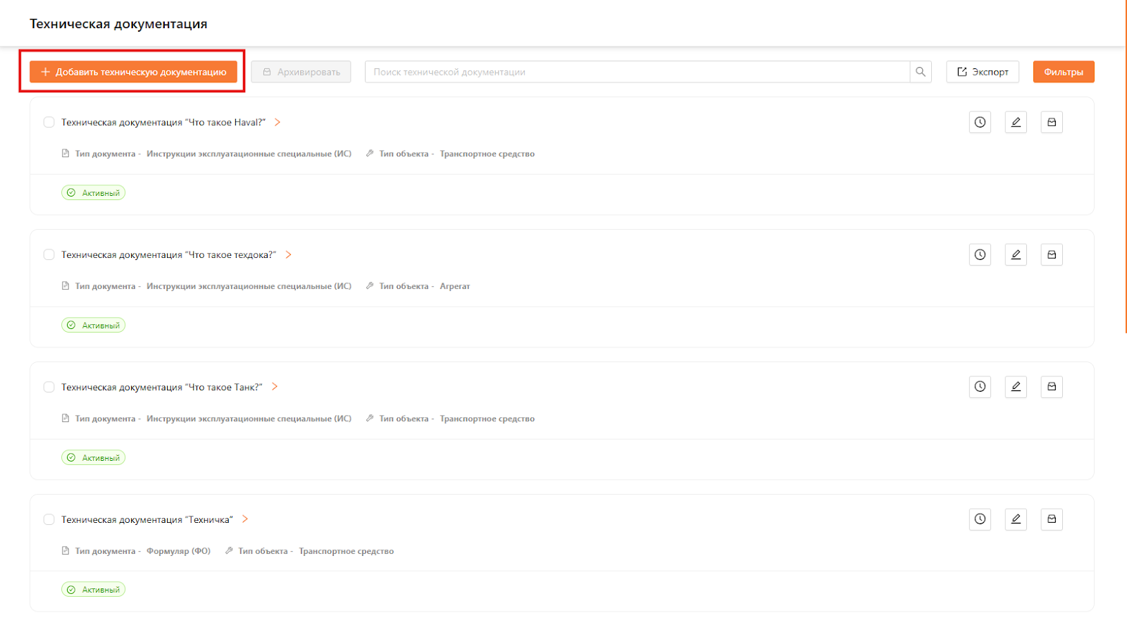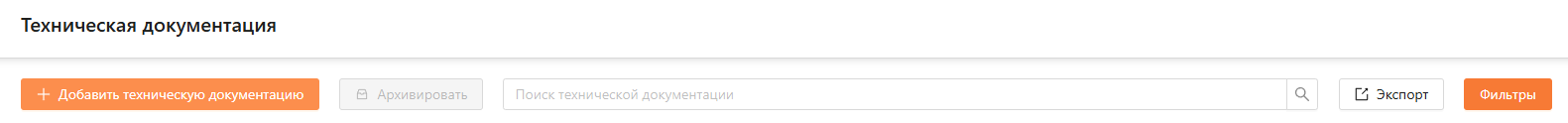Добавить техническую документацию: кнопка для добавления новой технической документации.