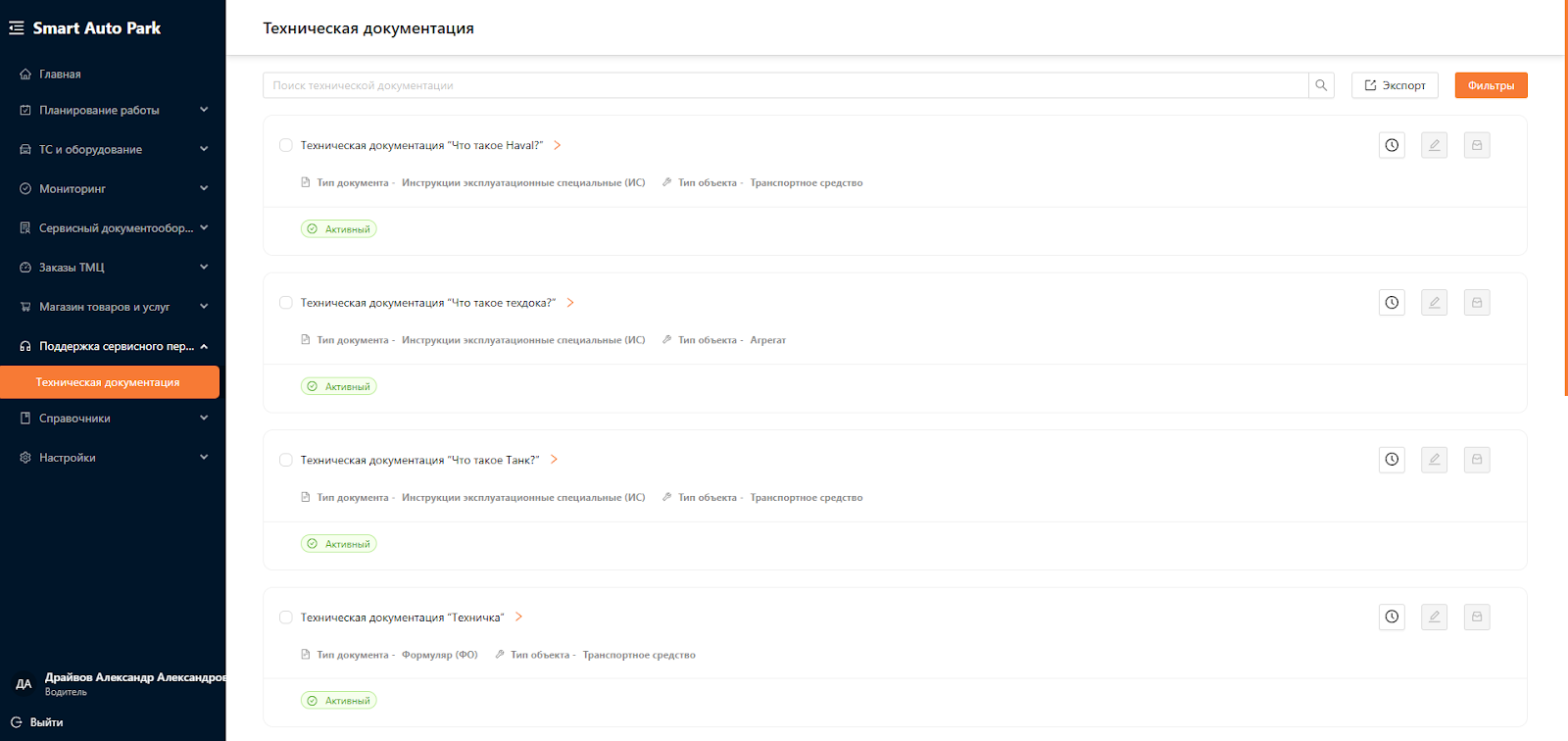 Система для управления автопарком предназначена для автоматизации и оптимизации всех аспектов эксплуатации и обслуживания транспортных средств и оборудования. Система является комплексным решением, охватывающим всю деятельность, связанную с управлением автопарка, от учета и мониторинга транспортных средств до планирования и аналитики. Одним из подразделов Системы является “Техническая документация”.
