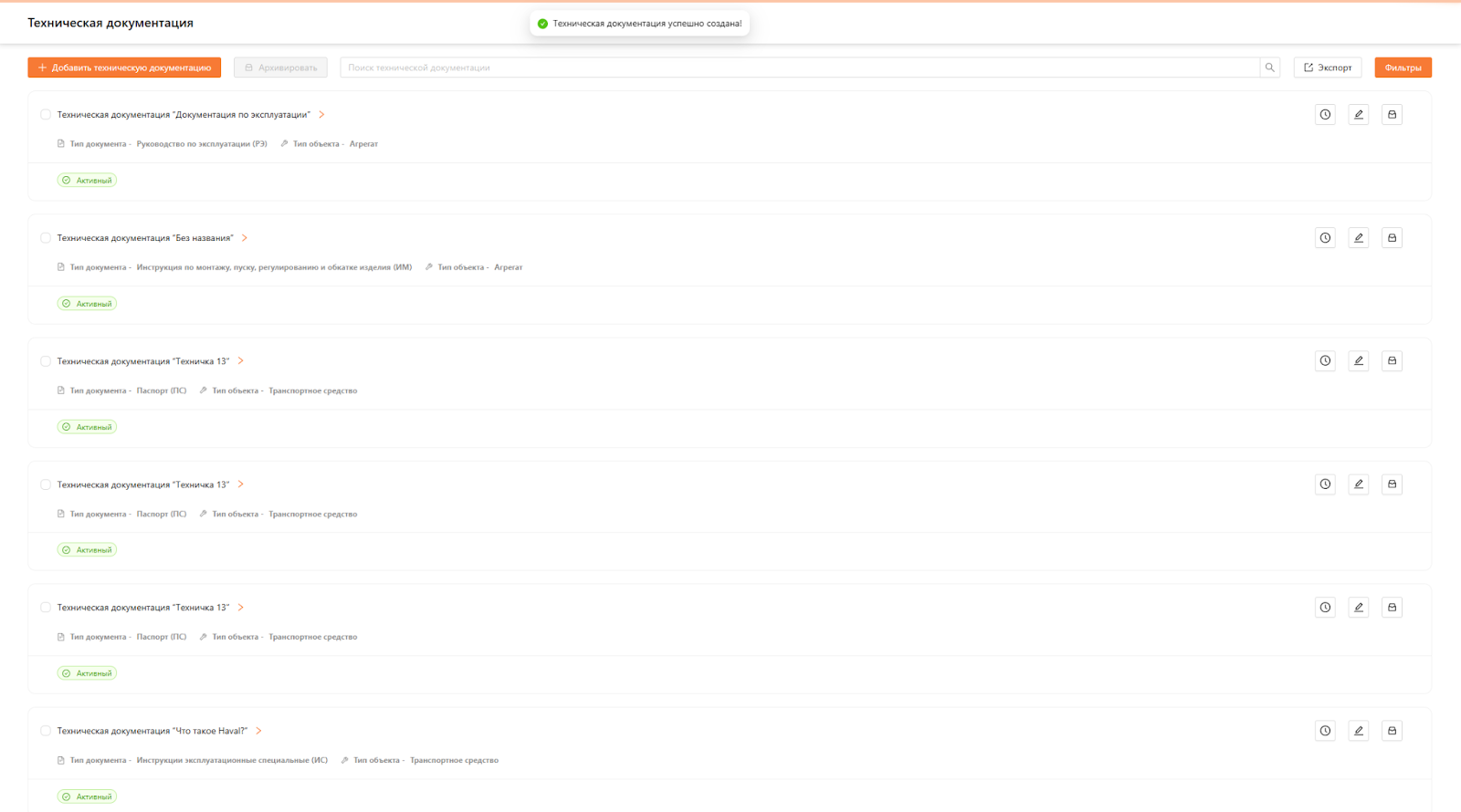 Система сообщит о сохранении данных технической документации и откроет список документации (см. рисунок 7).