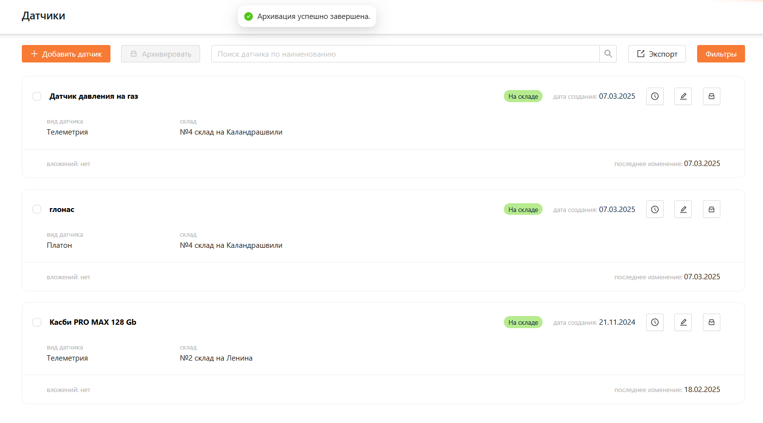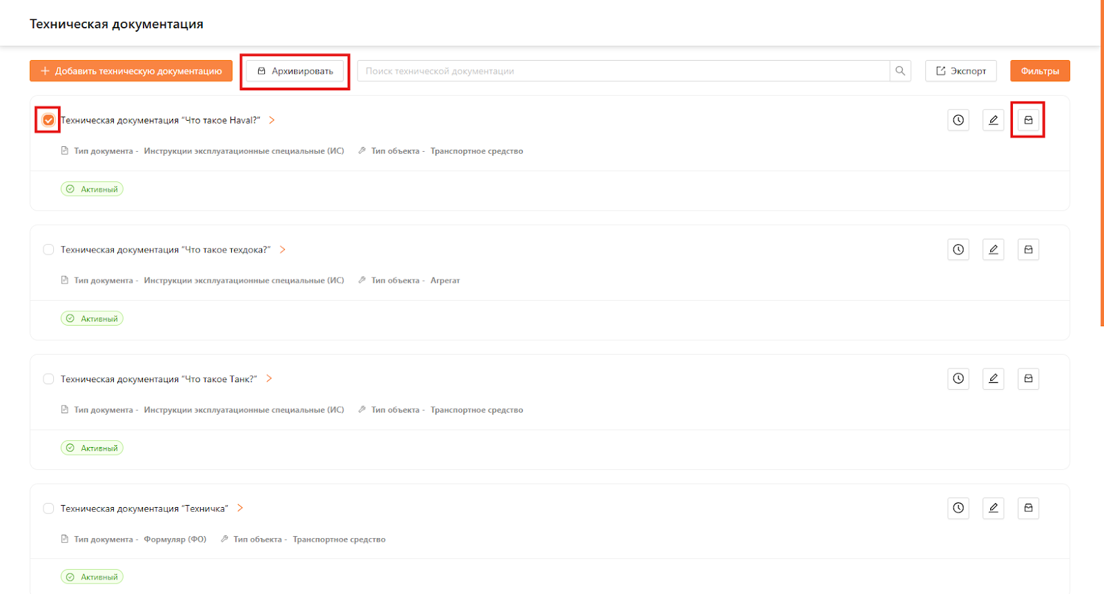 Для массового или одиночного архивирования необходимо выбрать техническую документацию и нажать на кнопку “Архивировать” либо нажать на кнопку справа (см. рисунок 8).