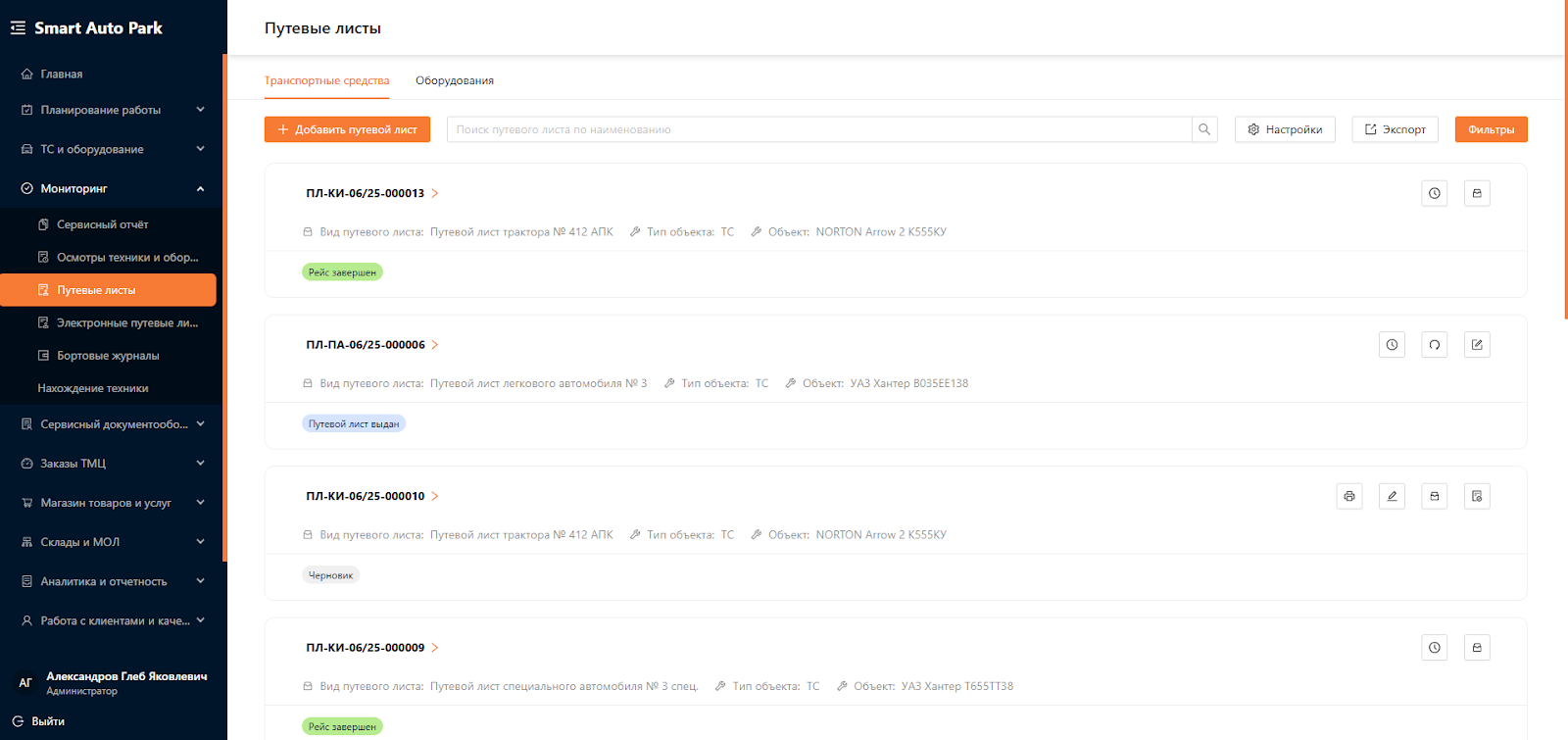Система для управления автопарком предназначена для автоматизации и оптимизации всех аспектов эксплуатации и обслуживания транспортных средств и оборудования. Система является комплексным решением, охватывающим всю деятельность, связанную с управлением автопарка, от учета и мониторинга транспортных средств до планирования и аналитики. Одним из подразделов Системы является “Путевые листы”.