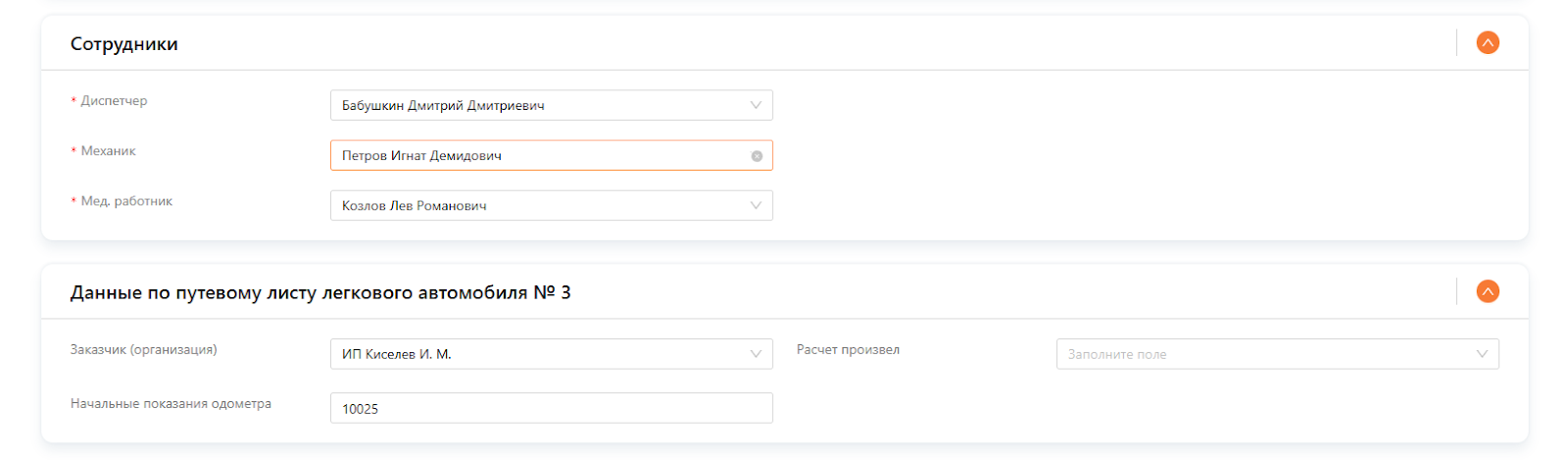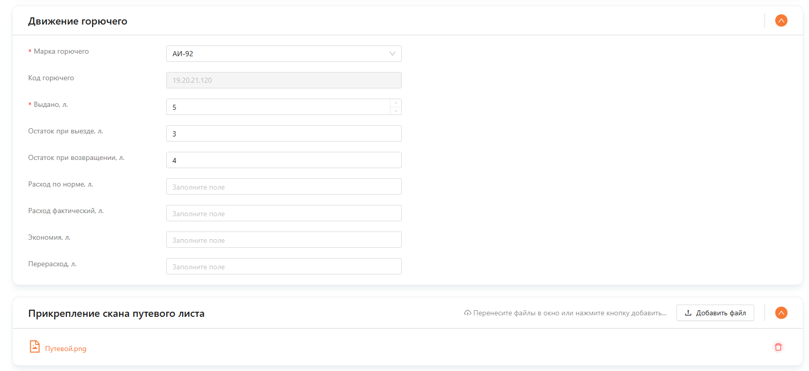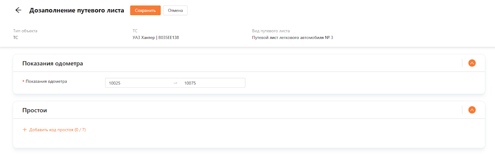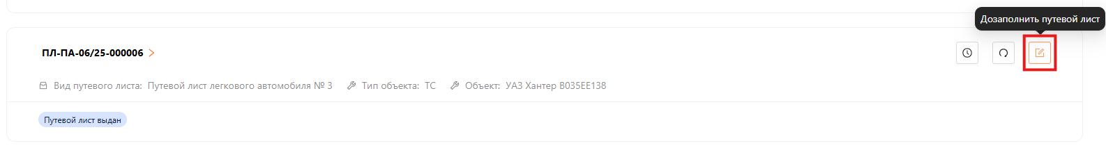 Дозаполнение путевого листа