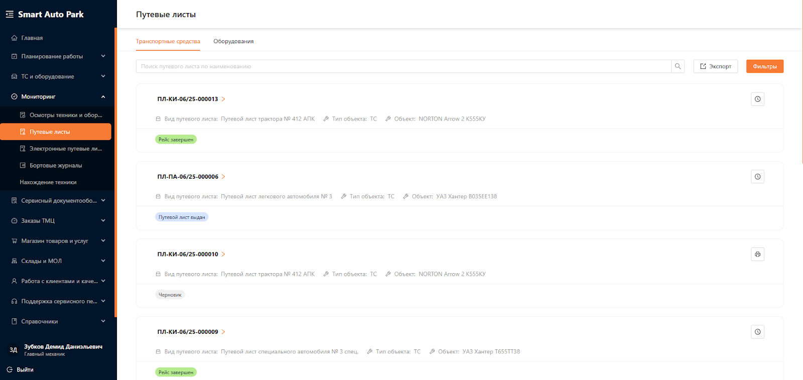 Пользователям с ролью “Механик”, “Главный механик”, “Водитель”, “Машинист”, “Подписант”, “Операционист” доступны кнопки “Экспорт” и “Фильтры” (см. рисунок 4). Для остальных пользовательских ролей данные опции заблокированы.