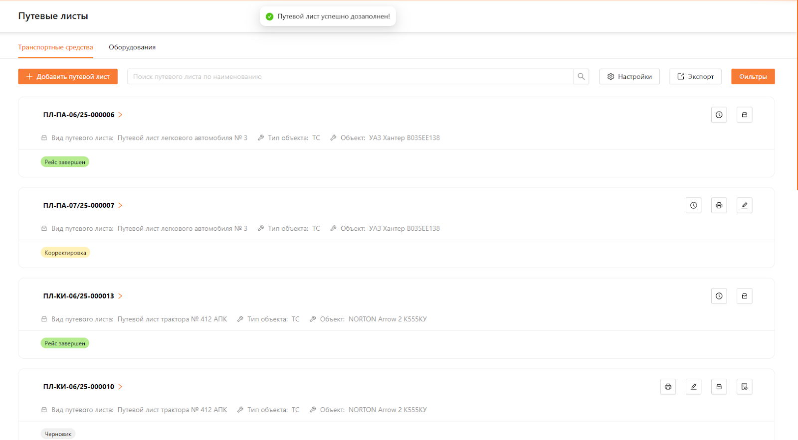 После дозаполнения заполнения нажмите кнопку “Добавить”. Система сообщит о сохранении дозаполненных данных и откроет список путевых листов (см. рисунок 22).