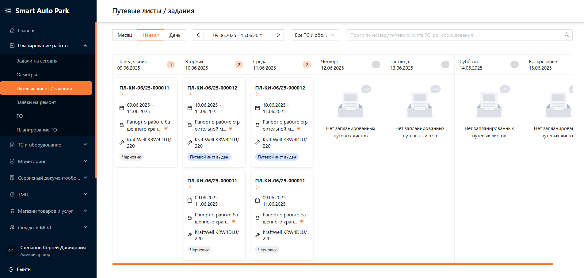 Данный раздел предназначен для просмотра всех путевых листов в календарном формате. Каждый пользователь, имеющий доступ к этому модулю, видит только те задачи, за которые он отвечает. На рисунке 25 представлены задачи, запланированные на текущий день.