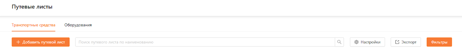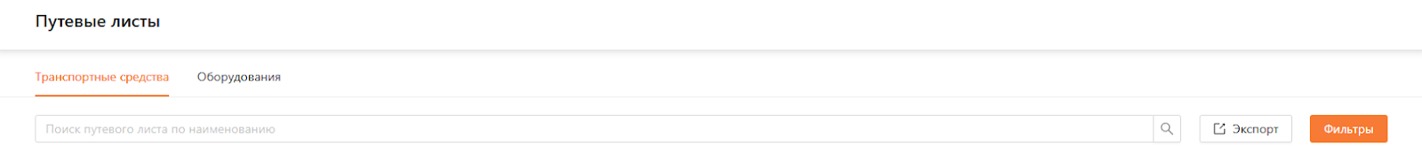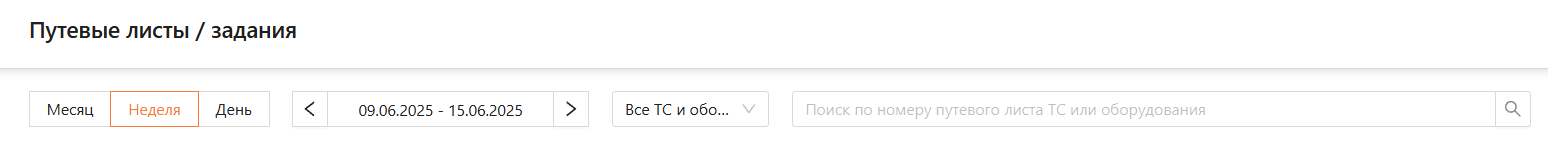 Поисковая строка: поиска путевых листов по номеру путевого листа, марке ТС/оборудования, модели ТС/оборудования, госномеру ТС, инвентарному/серийному номеру оборудования.