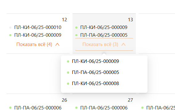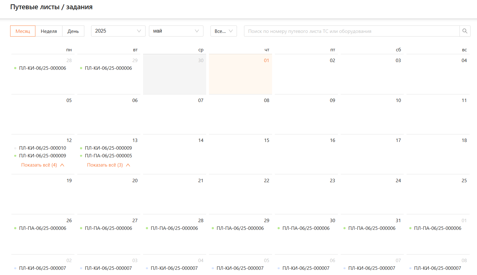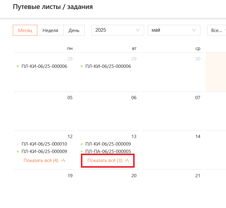 Если все путевые листы не помещаются в календаре месяца, нажмите «Показать все», чтобы ознакомиться со всеми путевыми листами (см. рисунками 27 и 28).