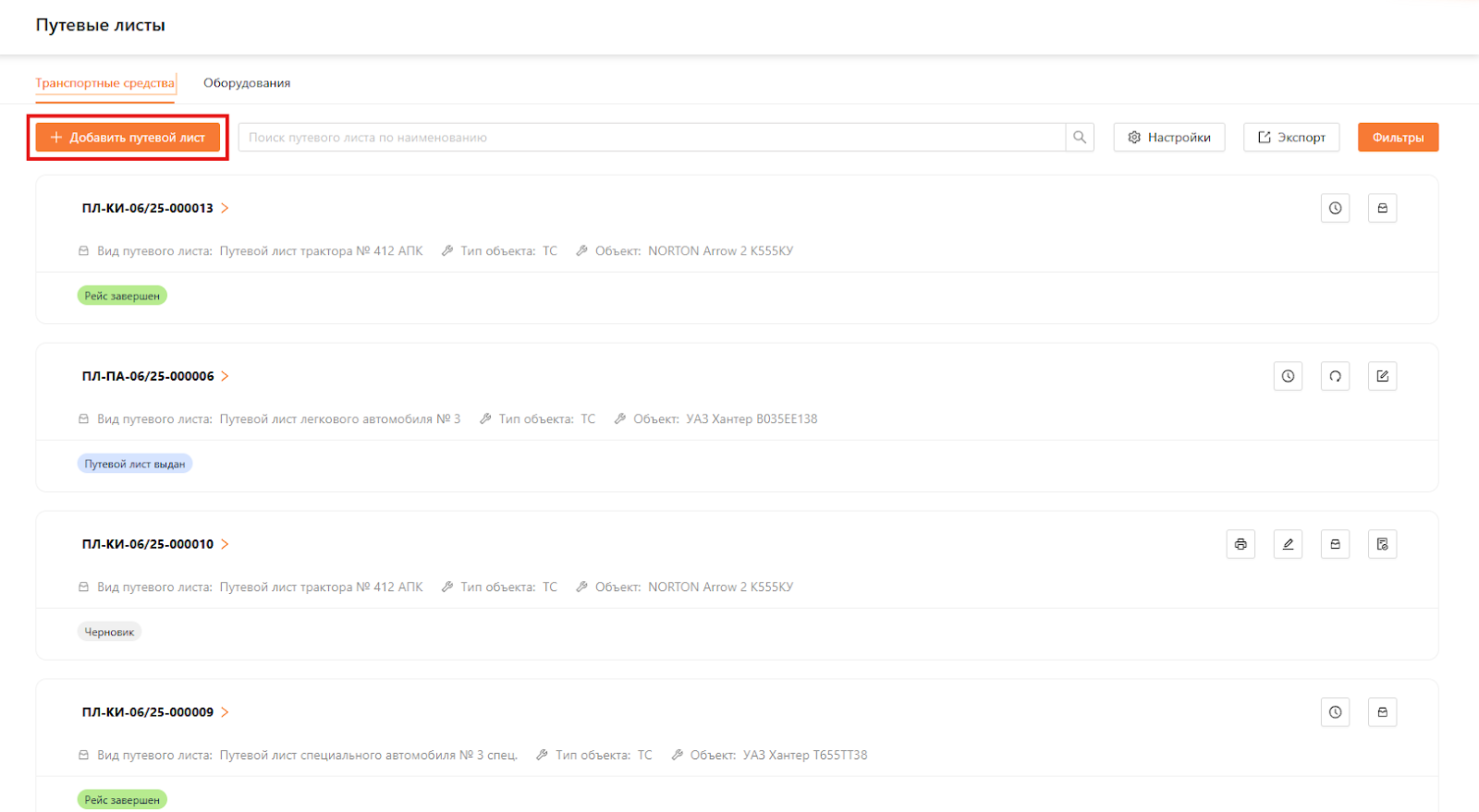В выбранной подсистеме у пользователей с ролью “Администратор”, “Менеджер автопарка” или “Диспетчер” есть доступ к кнопкам “Добавить путевой лист”, “Настройки”, “Экспорт” и “Фильтры” (см. рисунок 3).