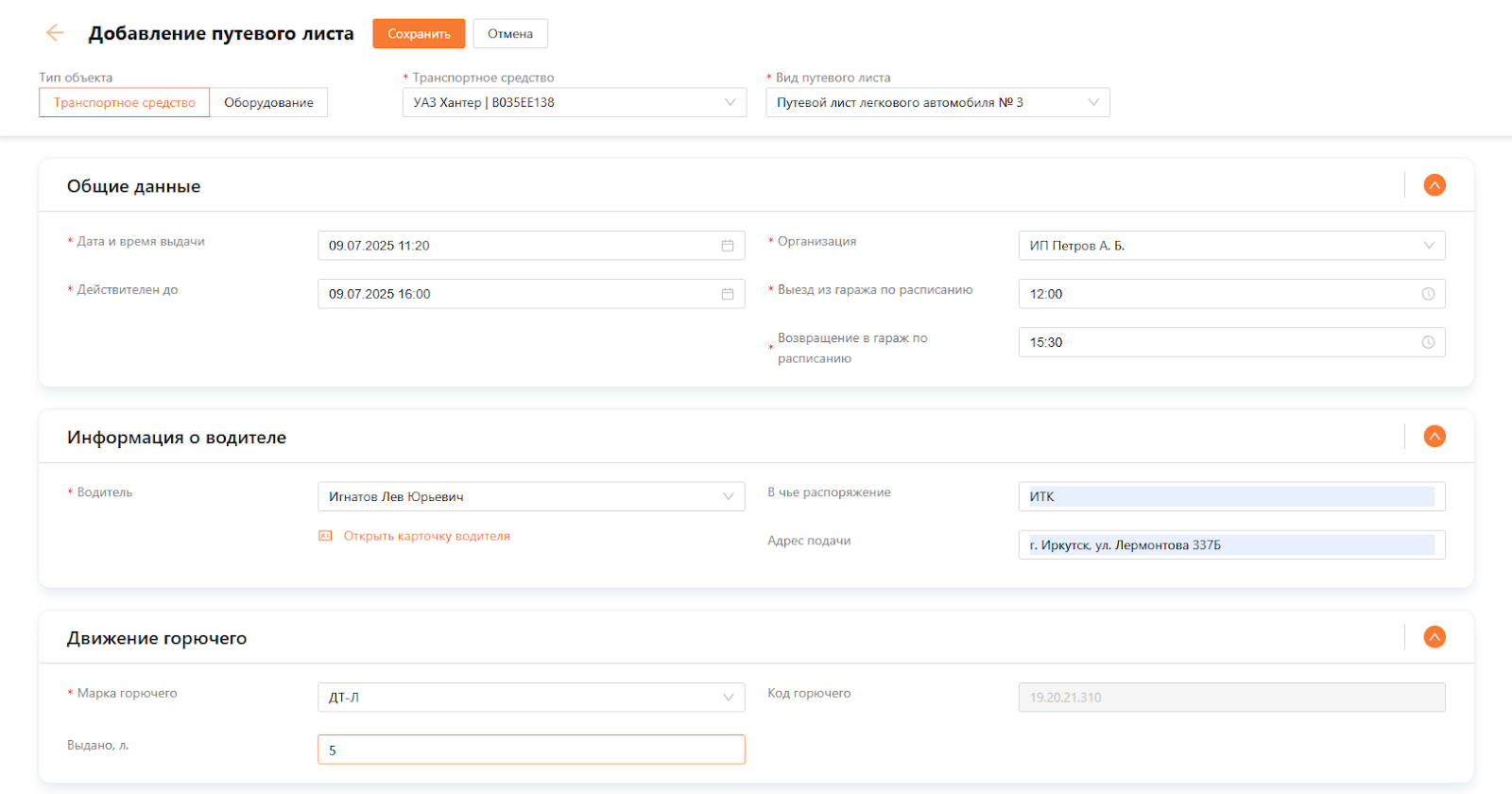 Добавление путевого листа