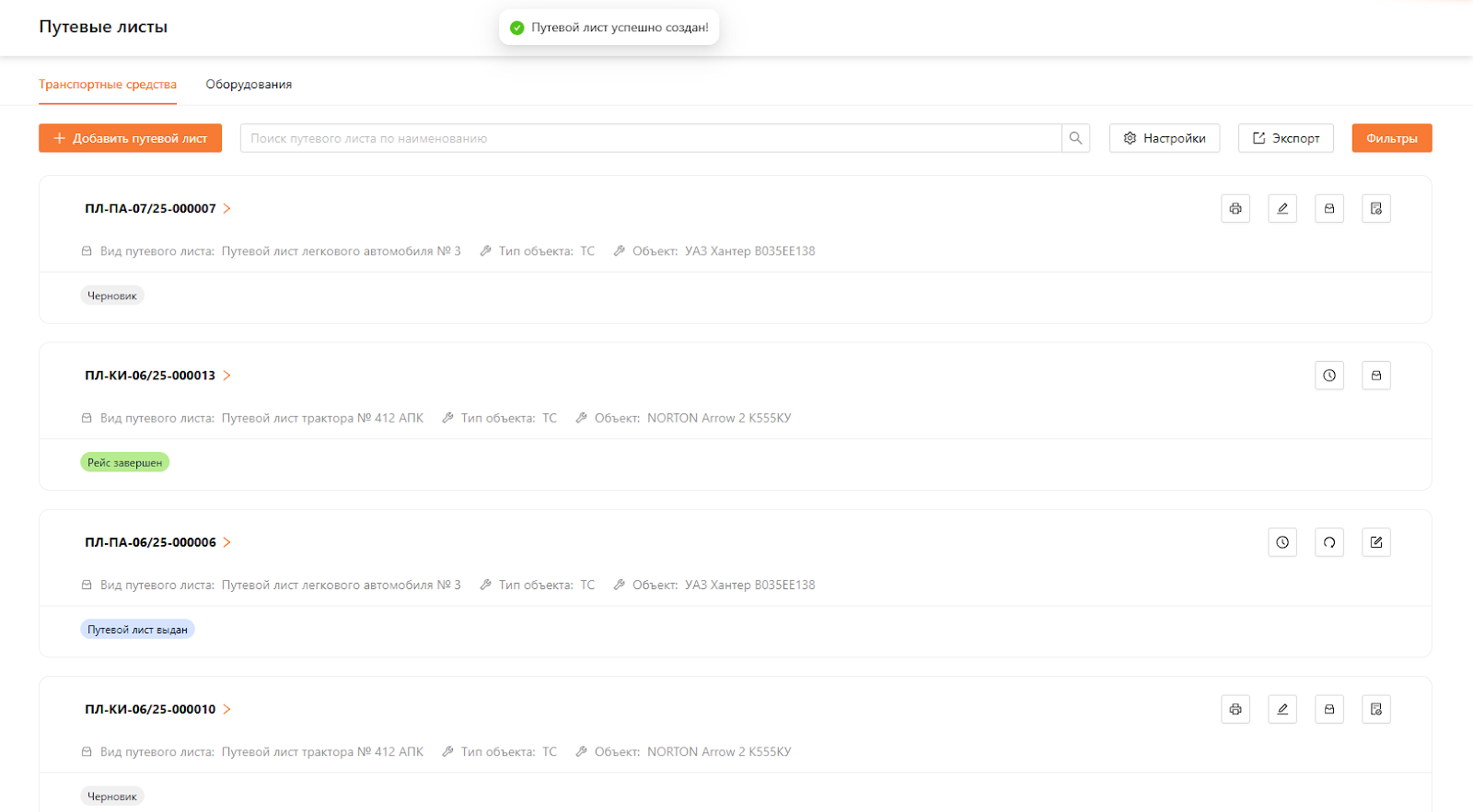 После завершения заполнения нажмите кнопку “Добавить”. Система сообщит о сохранении данных путевого листа в статусе “Черновик” и откроет список путевых листов (см. рисунок 9).