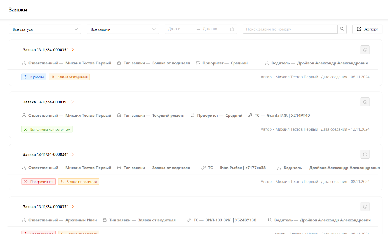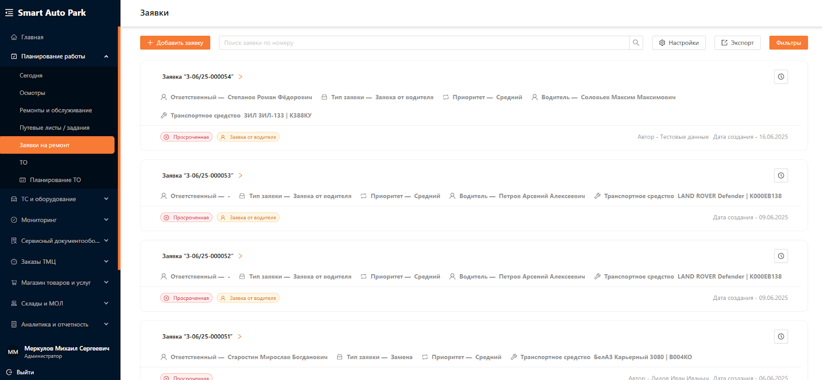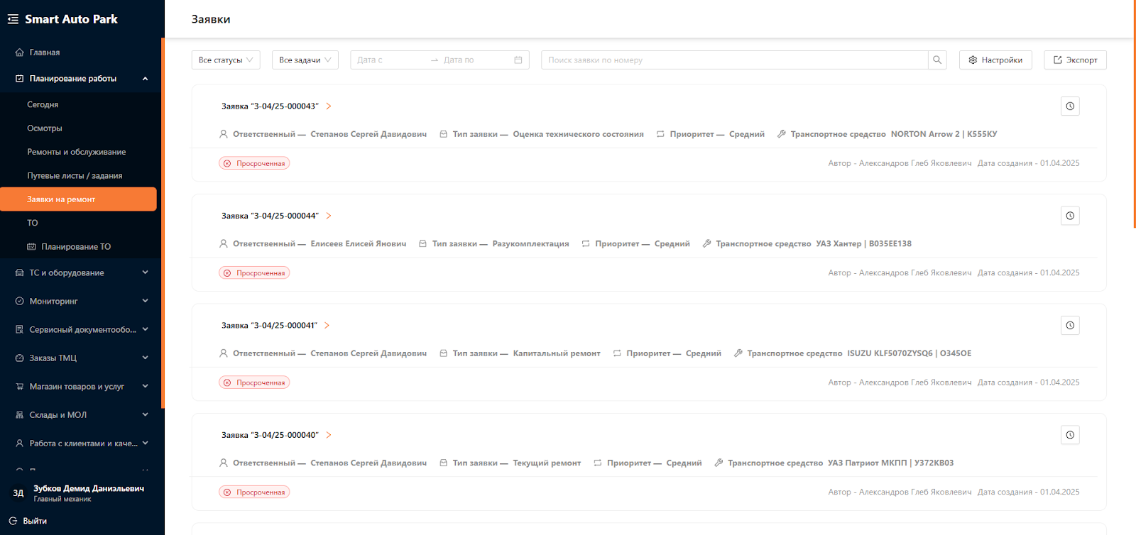 Система для управления автопарком предназначена для автоматизации и оптимизации всех аспектов эксплуатации и обслуживания транспортных средств и оборудования. Система является комплексным решением, охватывающим всю деятельность, связанную с управлением автопарка, от учета и мониторинга транспортных средств до планирования и аналитики. Одним из подразделов Системы является “Заявки на ремонт”.
