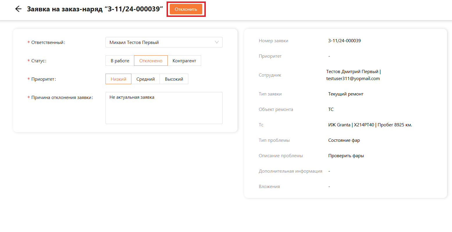 При выборе статуса “Отклонено” появляется поле “Причина отклонения заявки”, которое является обязательным для заполнения (см. рисунок 10). Для отклонения заявки нажимаем на кнопку “Отклонить”.