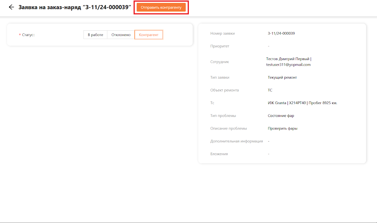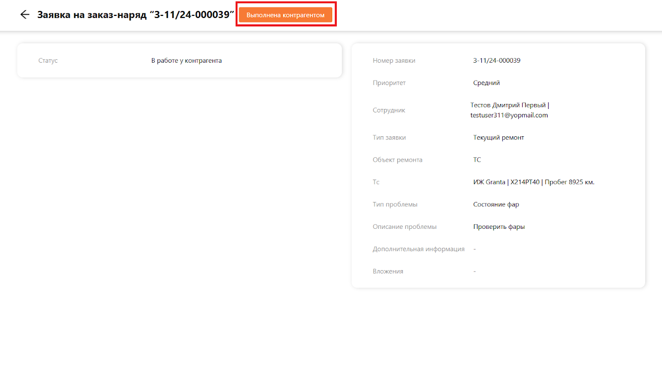 После того как контрагент выполнит работу, открываем заявку и нажимаем на кнопку “Выполнена контрагентом” (см. рисунок 12).