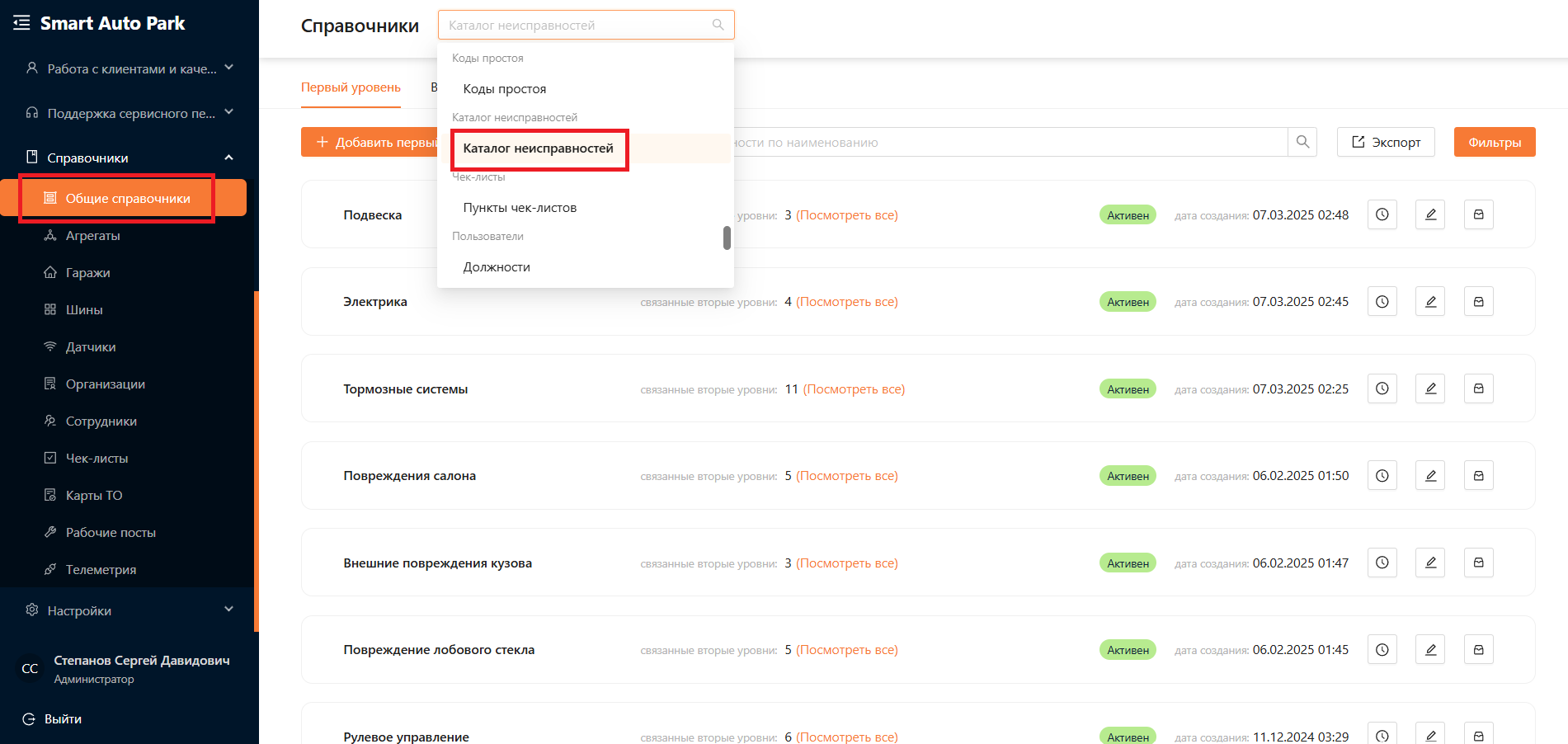Неисправность первого уровня в заявках отображается как причина обращения. Для начала необходимо перейти в каталог неисправностей, который расположен в подразделе “Общие справочники” (см. рисунок 14).