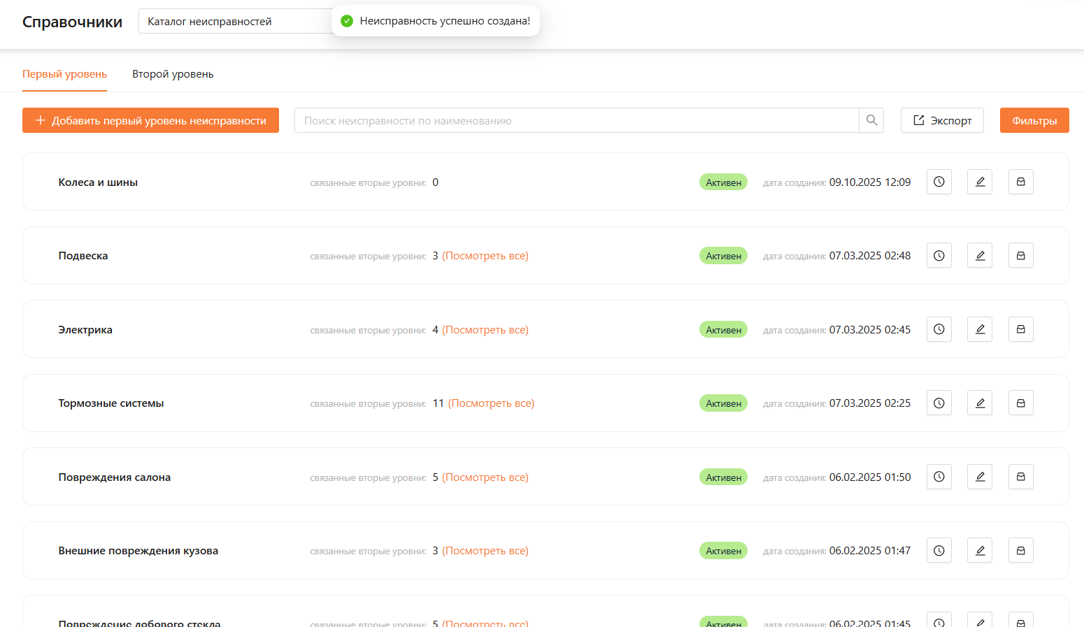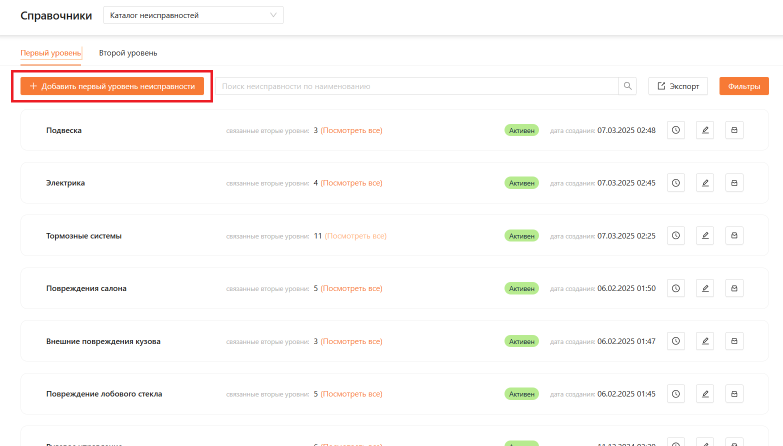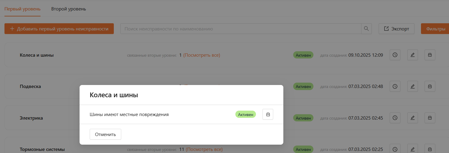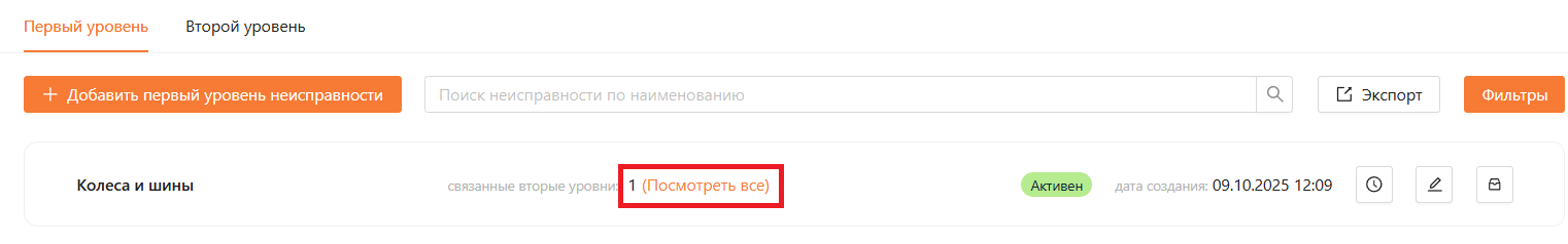 Для того чтобы посмотреть добавленные неисправности второго уровня, перейдите во вкладку “Первый уровень” и нажмите “Посмотреть все”, как представлено на рисунке 21 и 22.