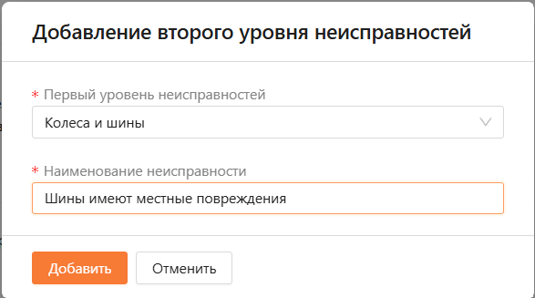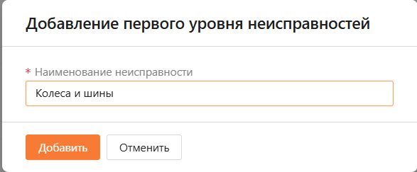 В открывшемся модальном окне нужно выбрать неисправность первого уровня и ввести наименование неисправности (см. рисунок 19).