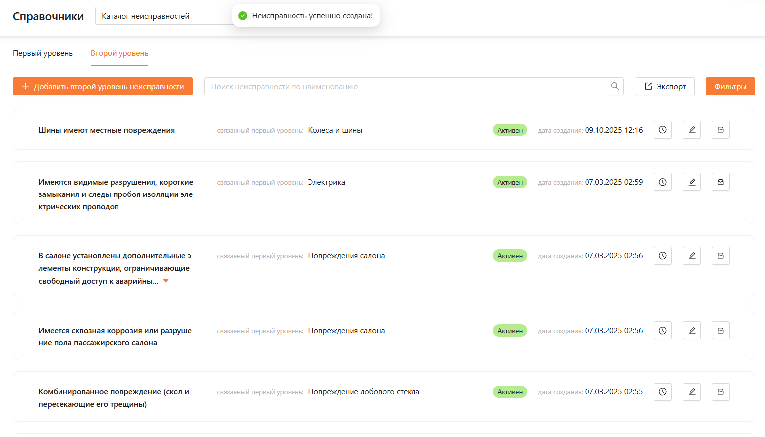 Для создания новой причины неисправности (неисправности первого уровня), выберите вкладку “Первый уровень” и нажмите на кнопку “Добавить первый уровень неисправность” в левом верхнем углу веб-страницы, используя одну из следующих пользовательских ролей: “Администратор”, “Менеджер автопарка” или “Операционист” (см. рисунок 15).