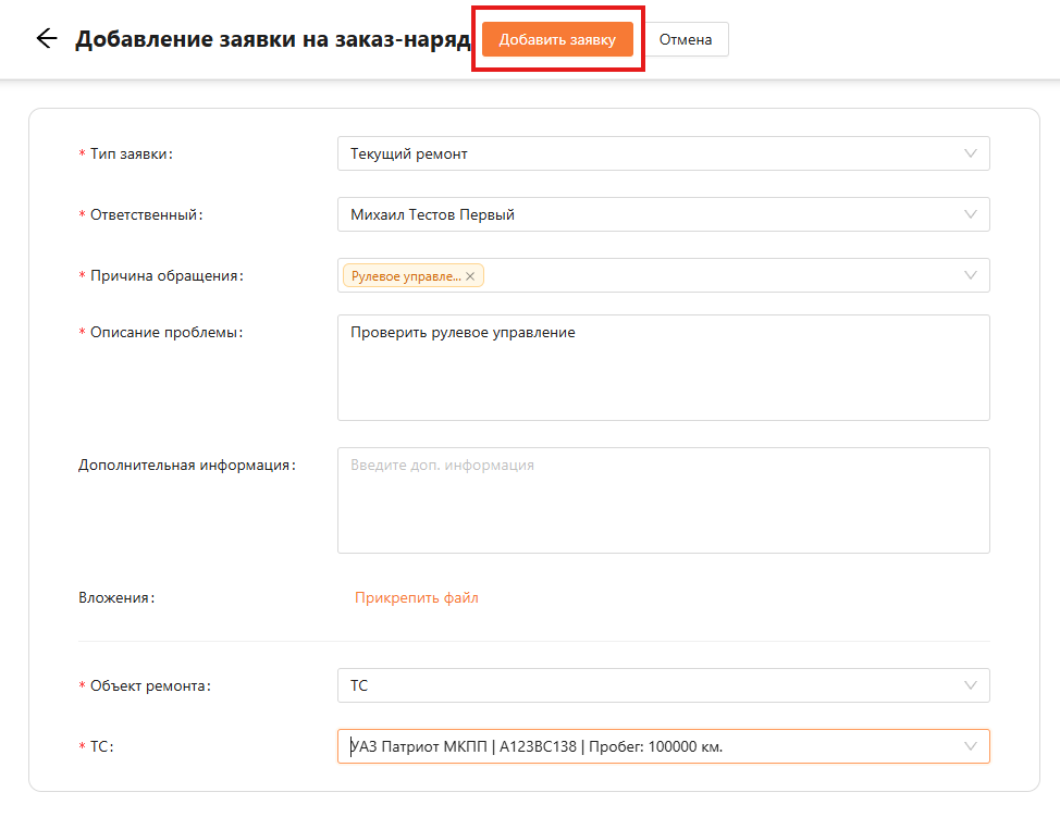Заполняем обязательные поля. После выбора значения в поле “Объект ремонта” отображается дополнительное поле для уточнения объекта ремонта. Для добавления заявки нажимаем на кнопку “Добавить заявку” с ролью “Администратор”, “Менеджер автопарка” или “Операционист” (см. рисунок 7).