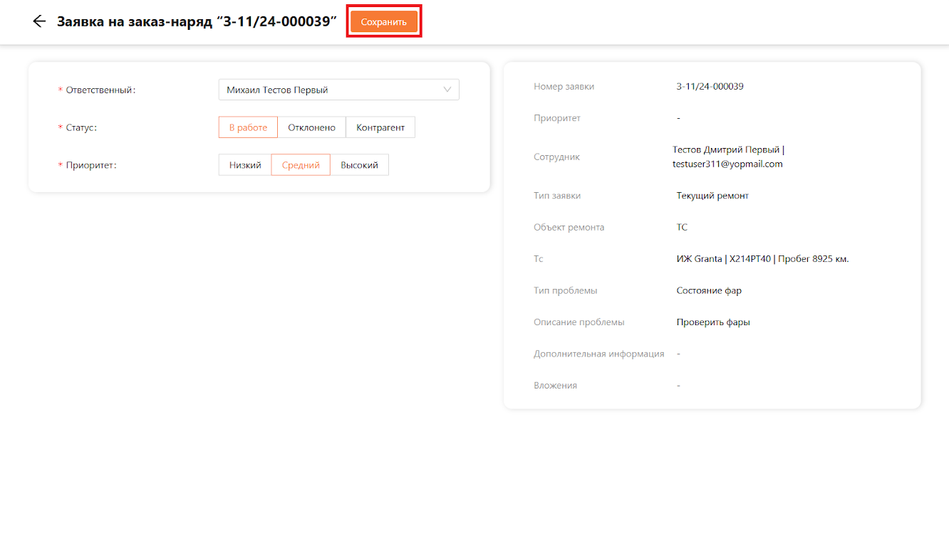 Если выбран статус “В работе”, необходимо также указать приоритет и сохранить изменения нажав на кнопку “Сохранить”. Подробности можно увидеть на рисунке 9.